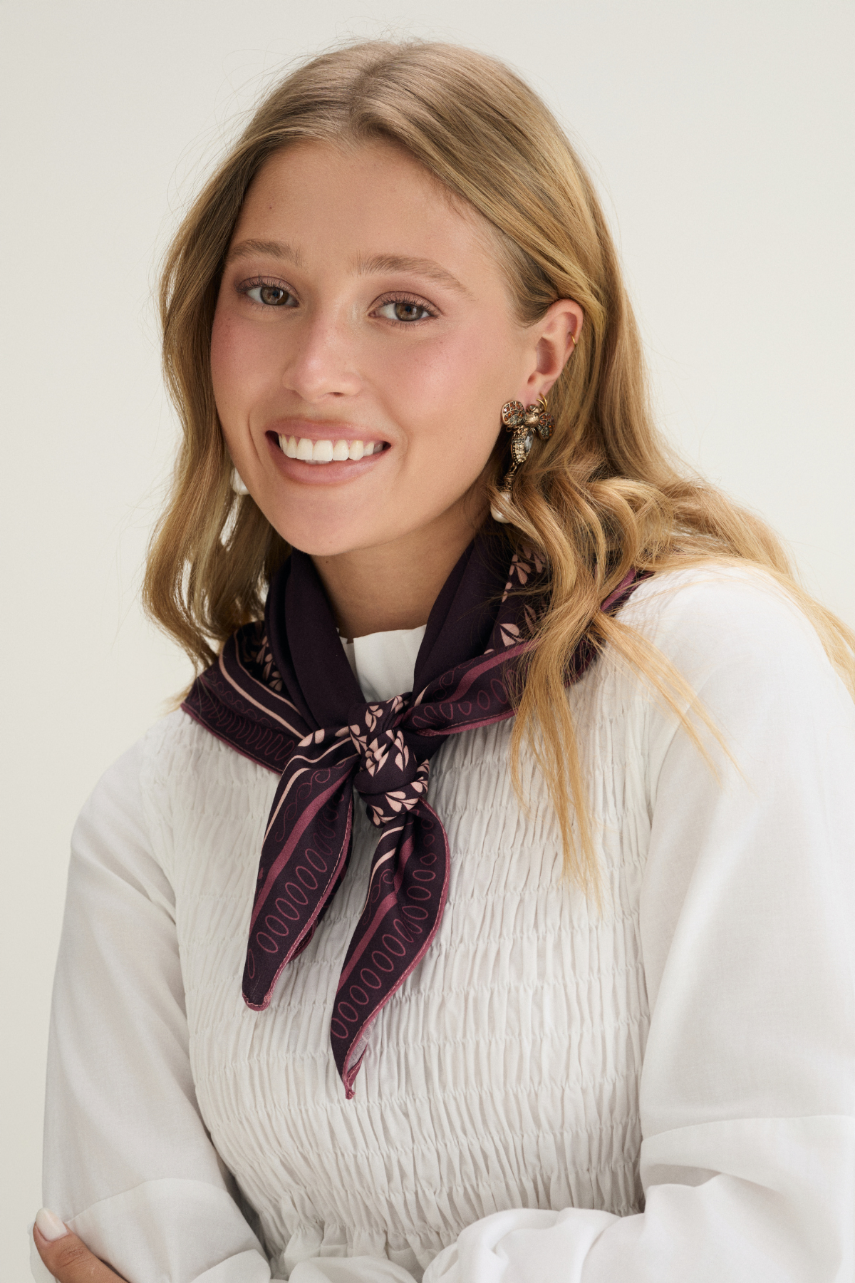 The Flor bandana is our little manifesto of romanticism – a scarf that will add character to any outfit. Made of high-quality, delicate viscose, it delights with its subtle sheen and lightness to the touch. The original La Vega pattern is inspired by floral compositions and feminine nature – it is a combination of classic style and freedom that will work perfectly all year round. Wear it however you like – tied around your neck, in your hair, on your bag, or even as an accessory to your favorite shirt. The Flor bandana is a detail that adds softness to everyday life. 100% viscose. Made in Poland. 70cm x 70cm.