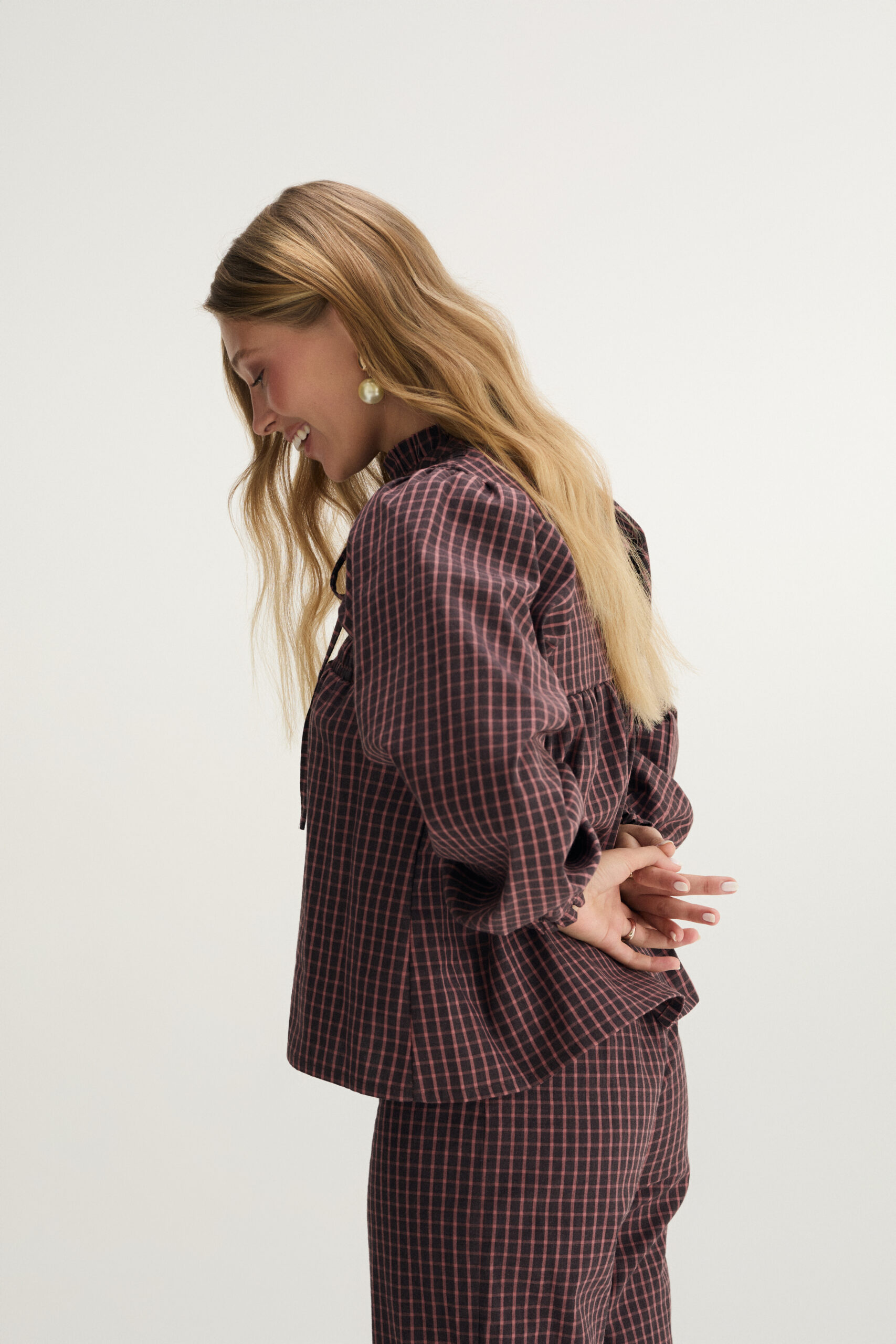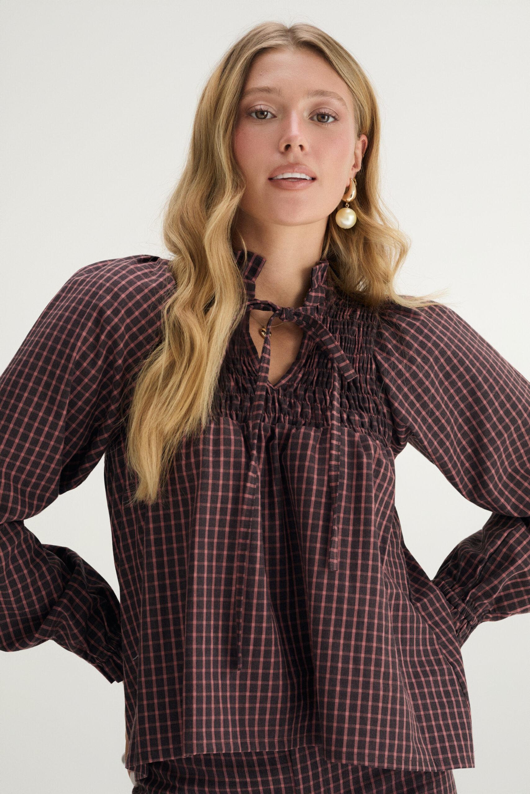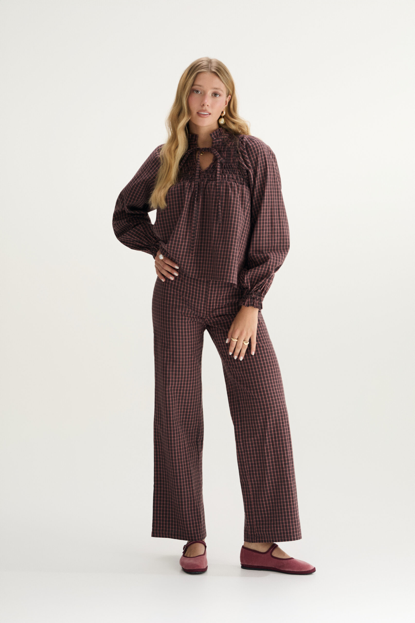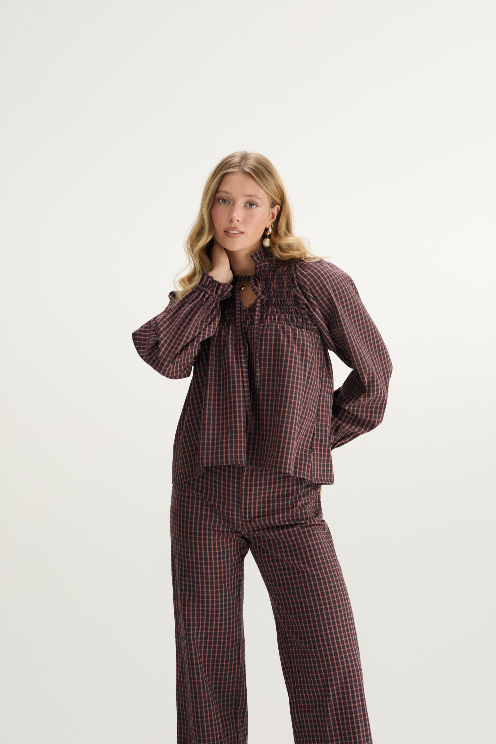 The LEA Blouse is the essence of comfort and style. With delicate gathers at the neckline, a relaxed cut, and subtle checks, it has a soft feminine feel. Perfect worn with the matching trousers or styled with your favorite jeans or skirt.