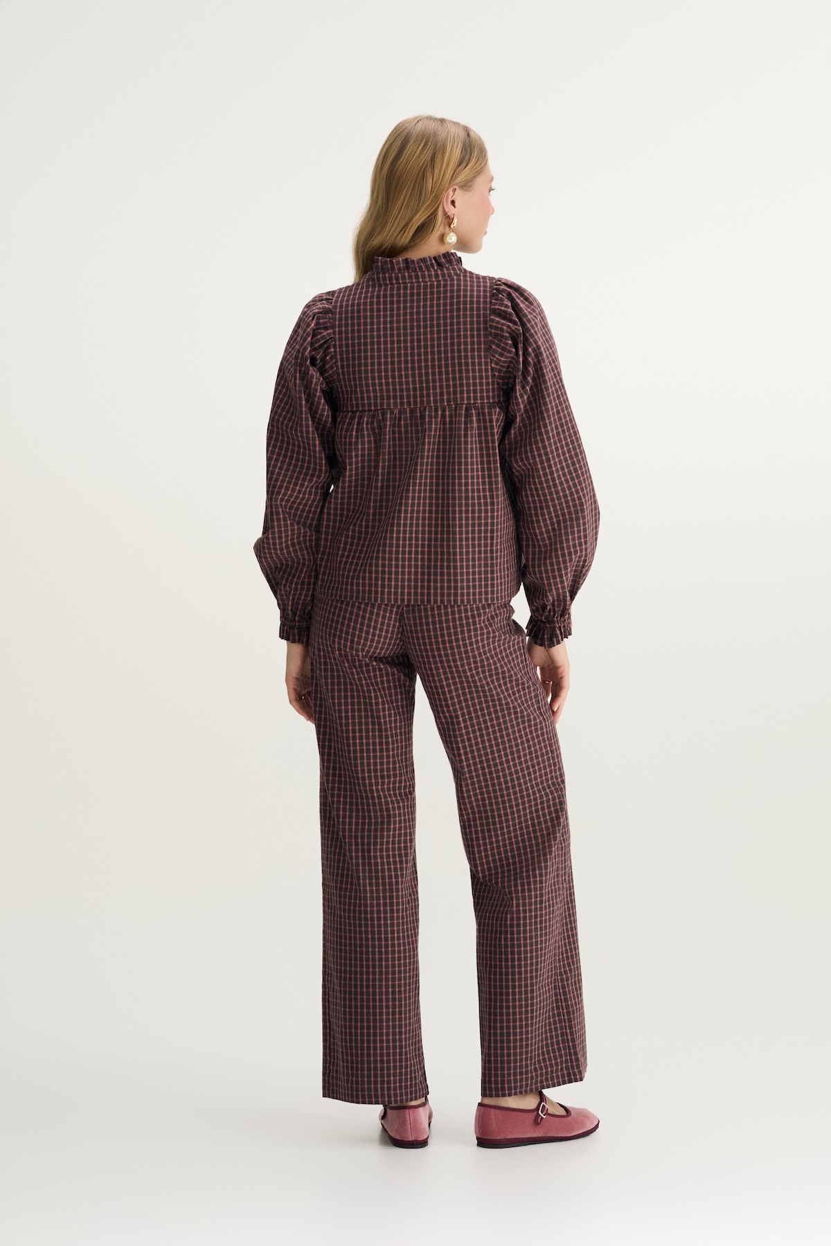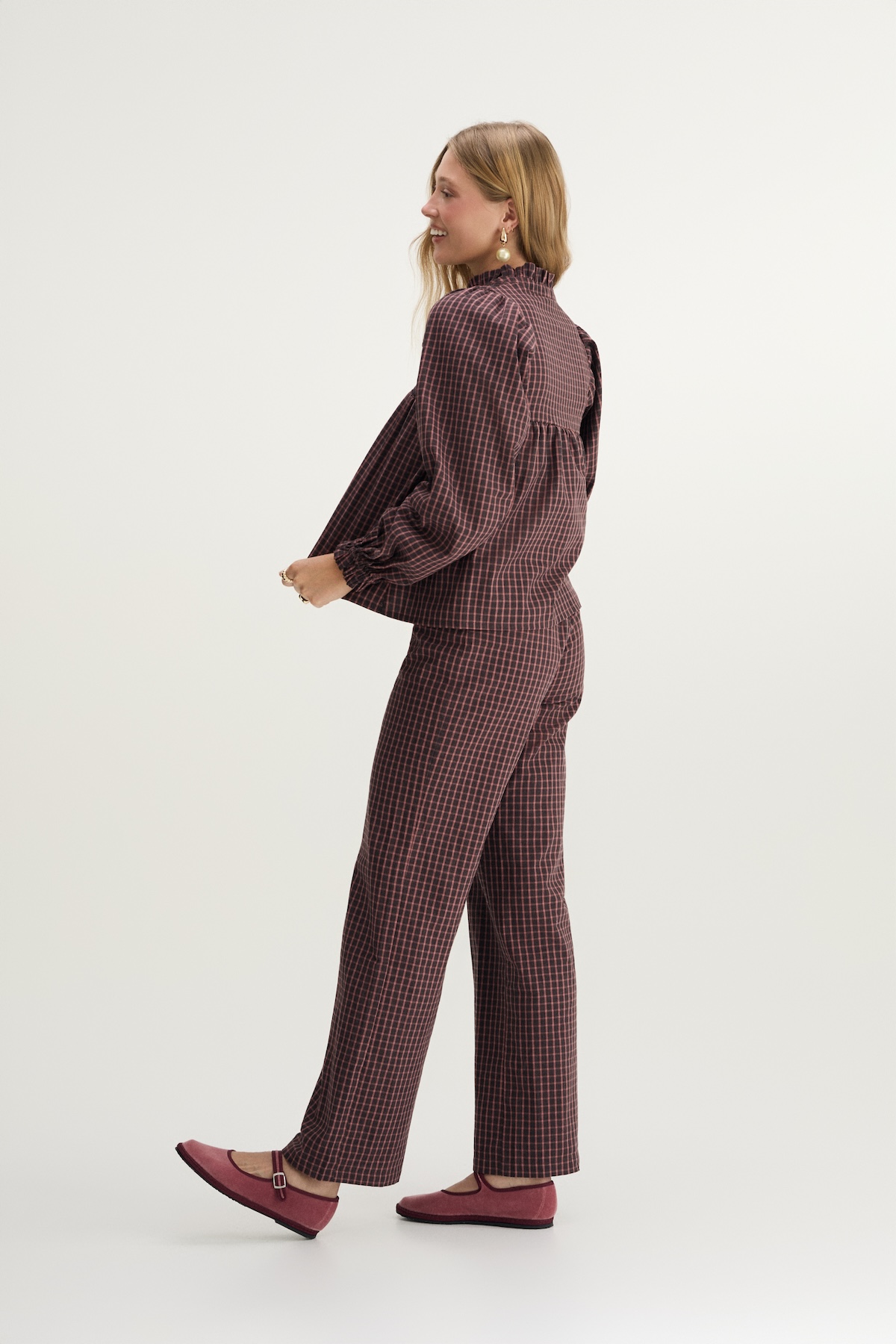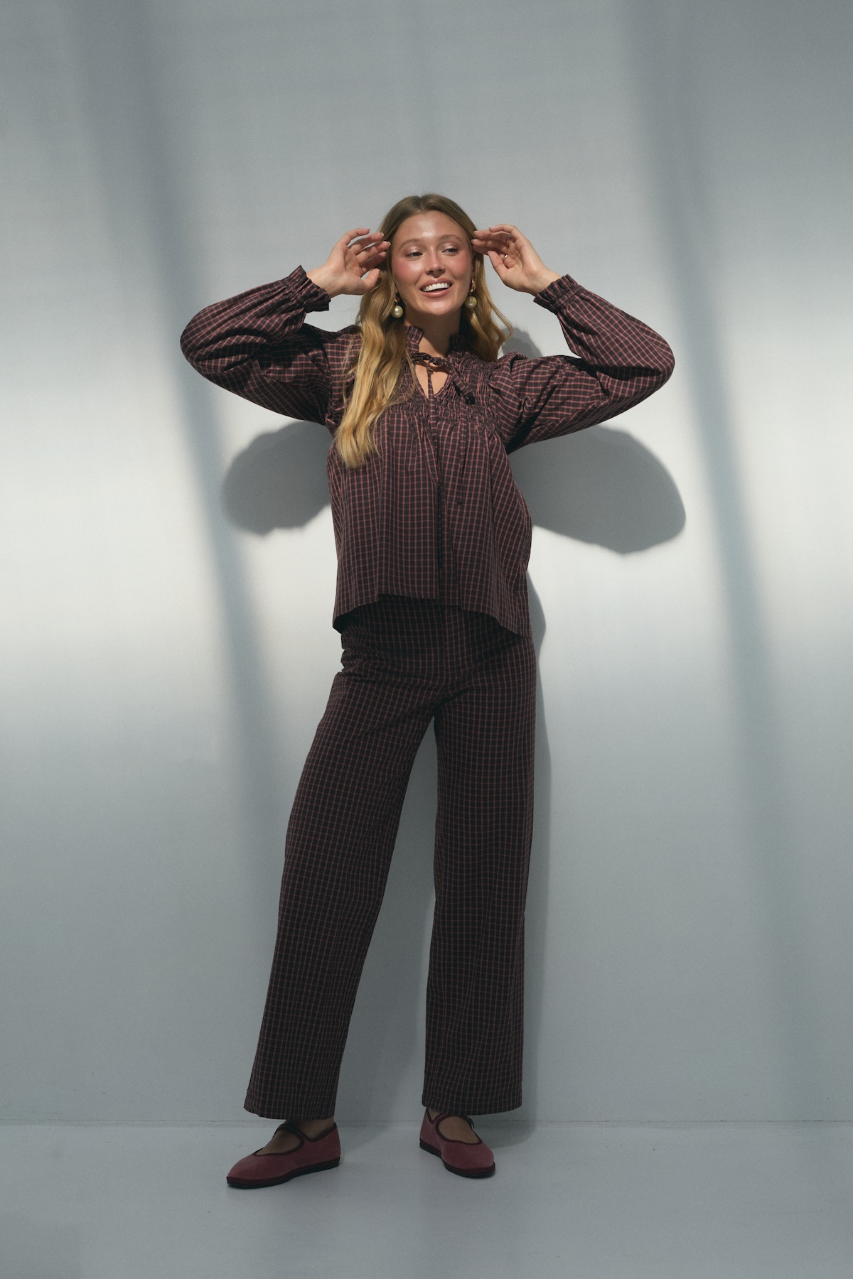Trousers that blend comfort and elegance. LEA feature a straight, slightly wider cut with an elastic waist and button, ensuring a flattering fit and all-day comfort. The subtle check pattern makes them perfect for both everyday wear and more elevated outfits.