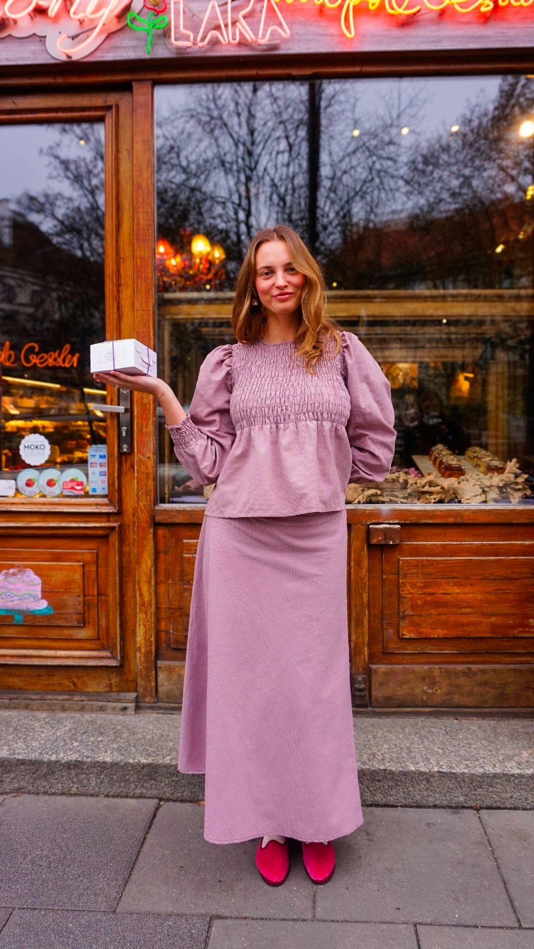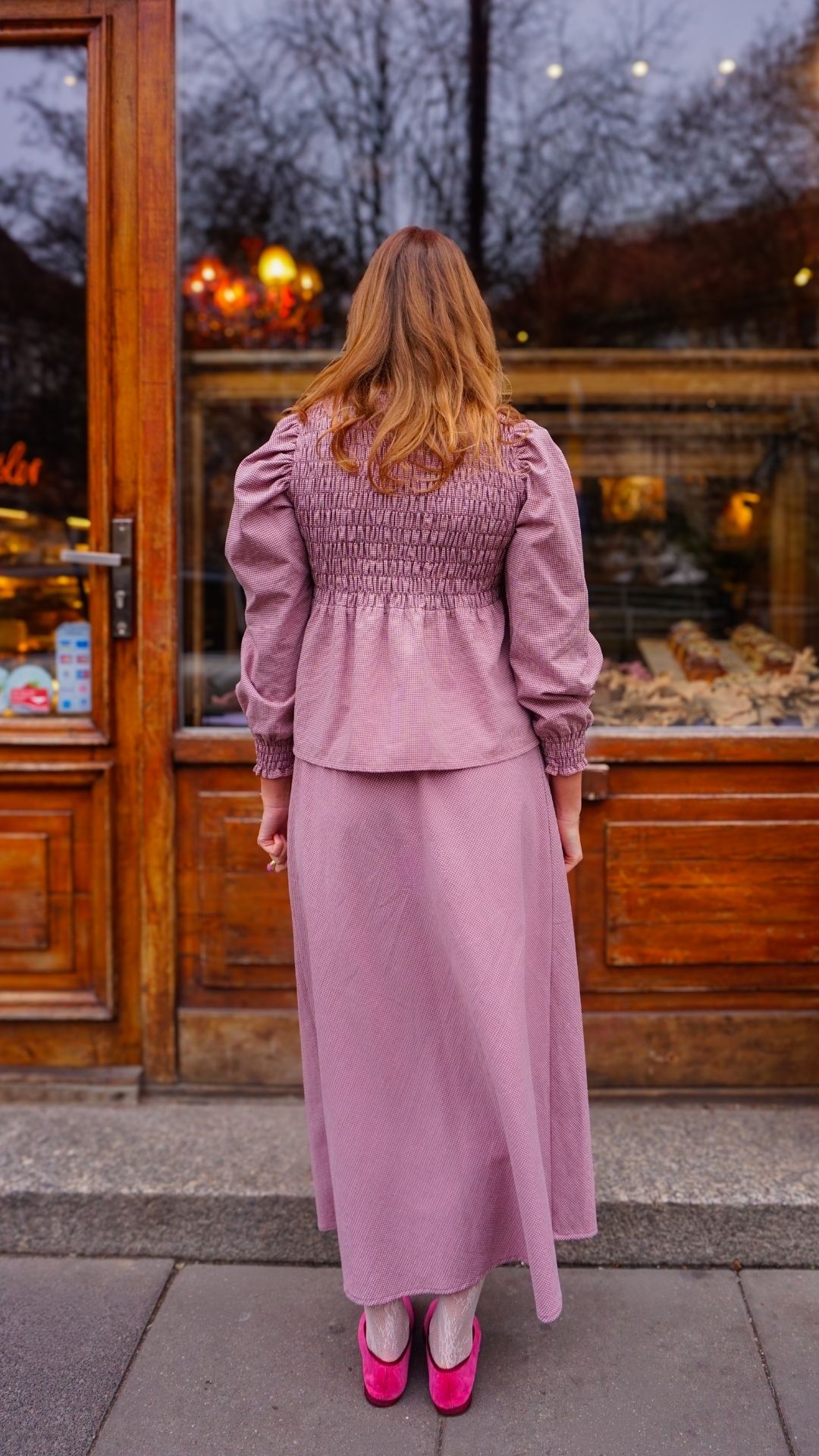 The Lola Top is a dreamy blend of softness and festive elegance. Designed with a beautifully smocked upper part, romantic puff sleeves, and elastic cuffs, it creates a flattering silhouette while remaining effortless and comfortable. The lightweight dusty pink fabric gives it a subtle, feminine charm—perfect for winter celebrations and everyday chic. Wear it on its own or pair it with the matching Lola Skirt for a complete, elevated look that feels timeless and beautifully delicate.