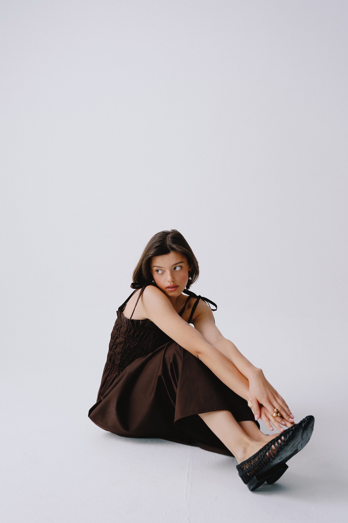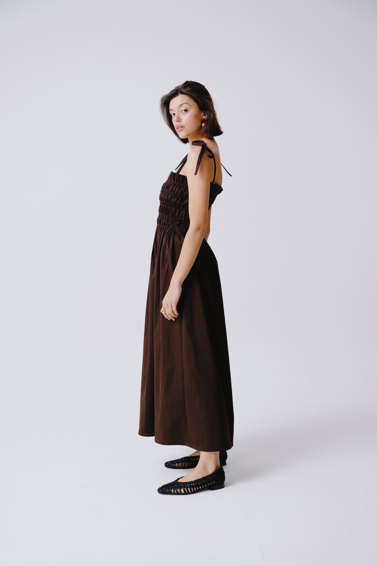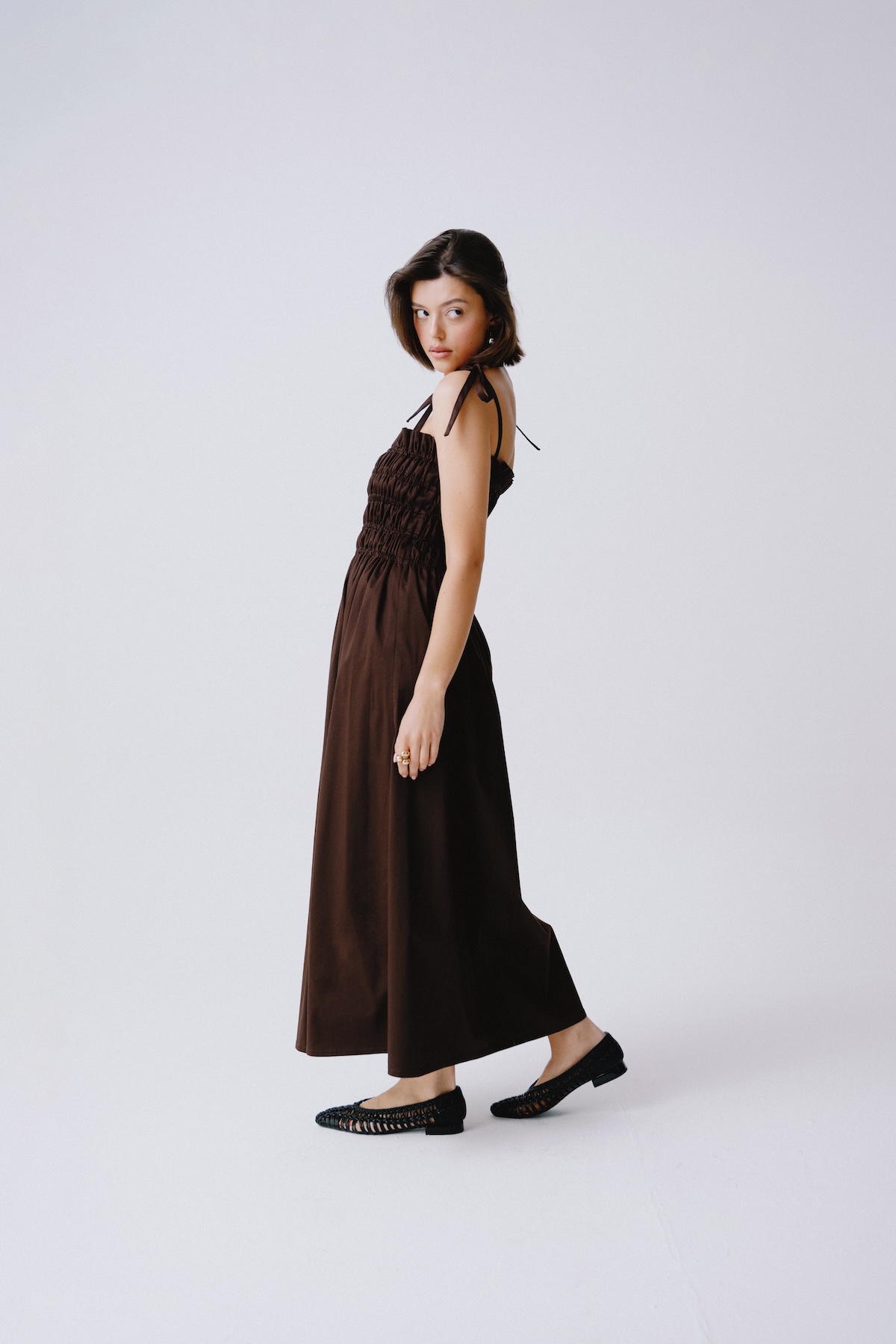 Brown strappy summer dress. Effortlessly feminine and light as summer air. The Matilde dress in a chocolate brown color is made for strolls, café mornings, and golden hour moments. With delicate ruching and straps, it flatters the silhouette while offering maximum comfort. An essential for your summer wardrobe.