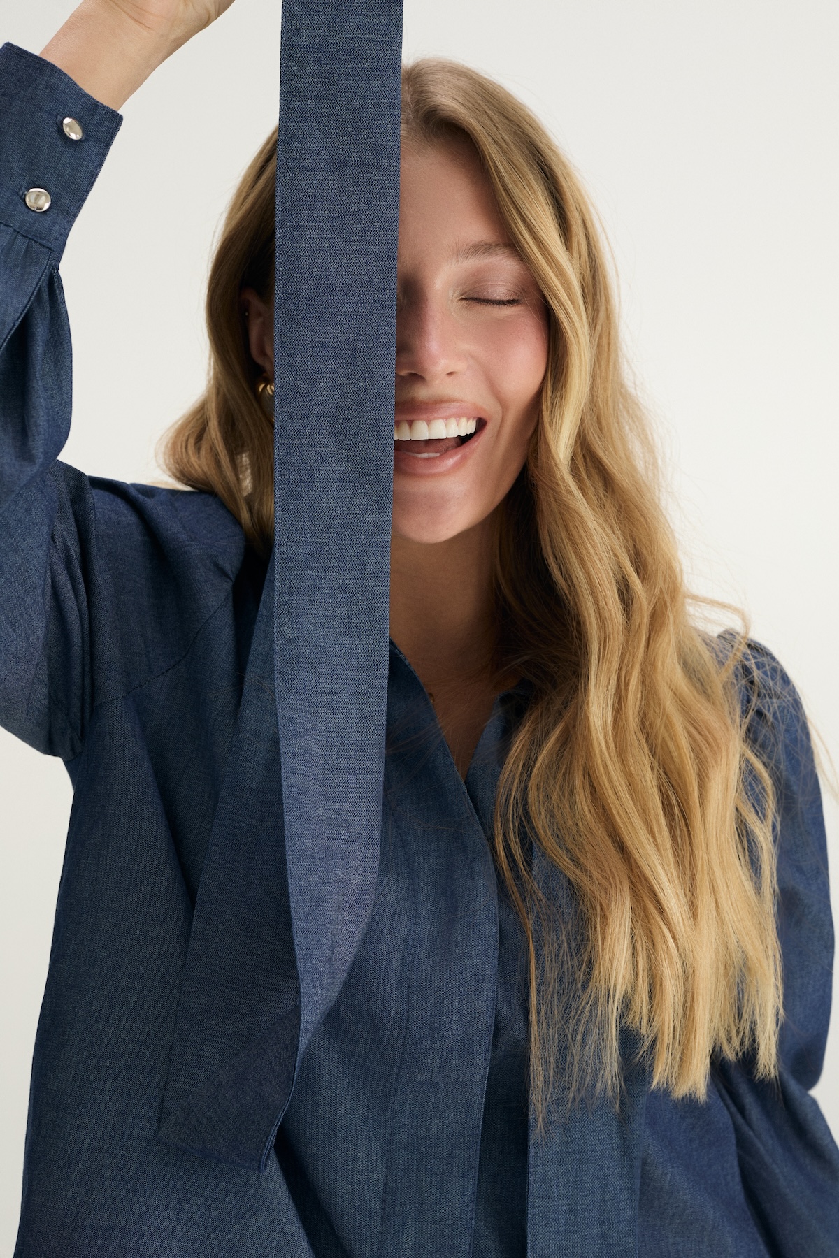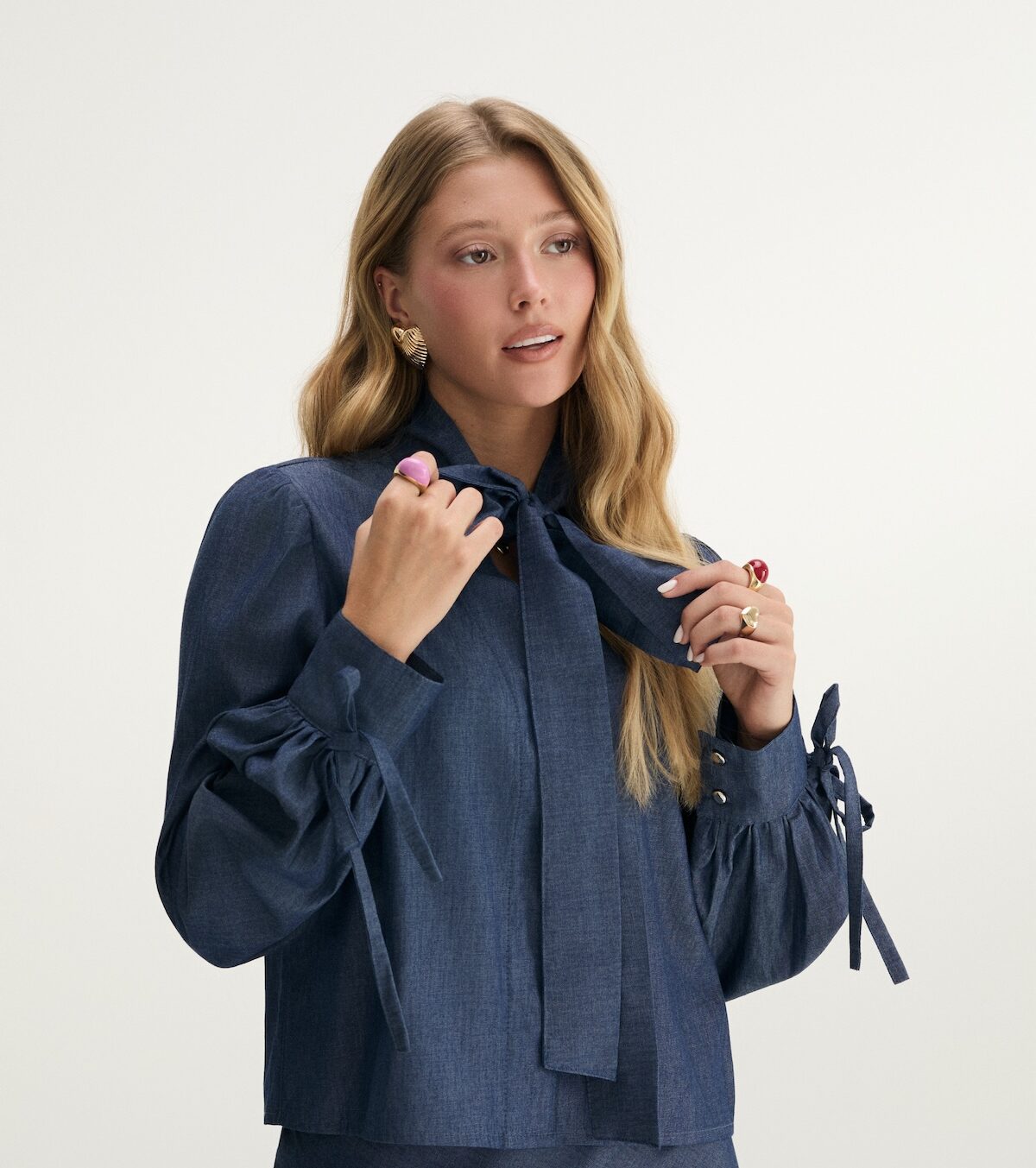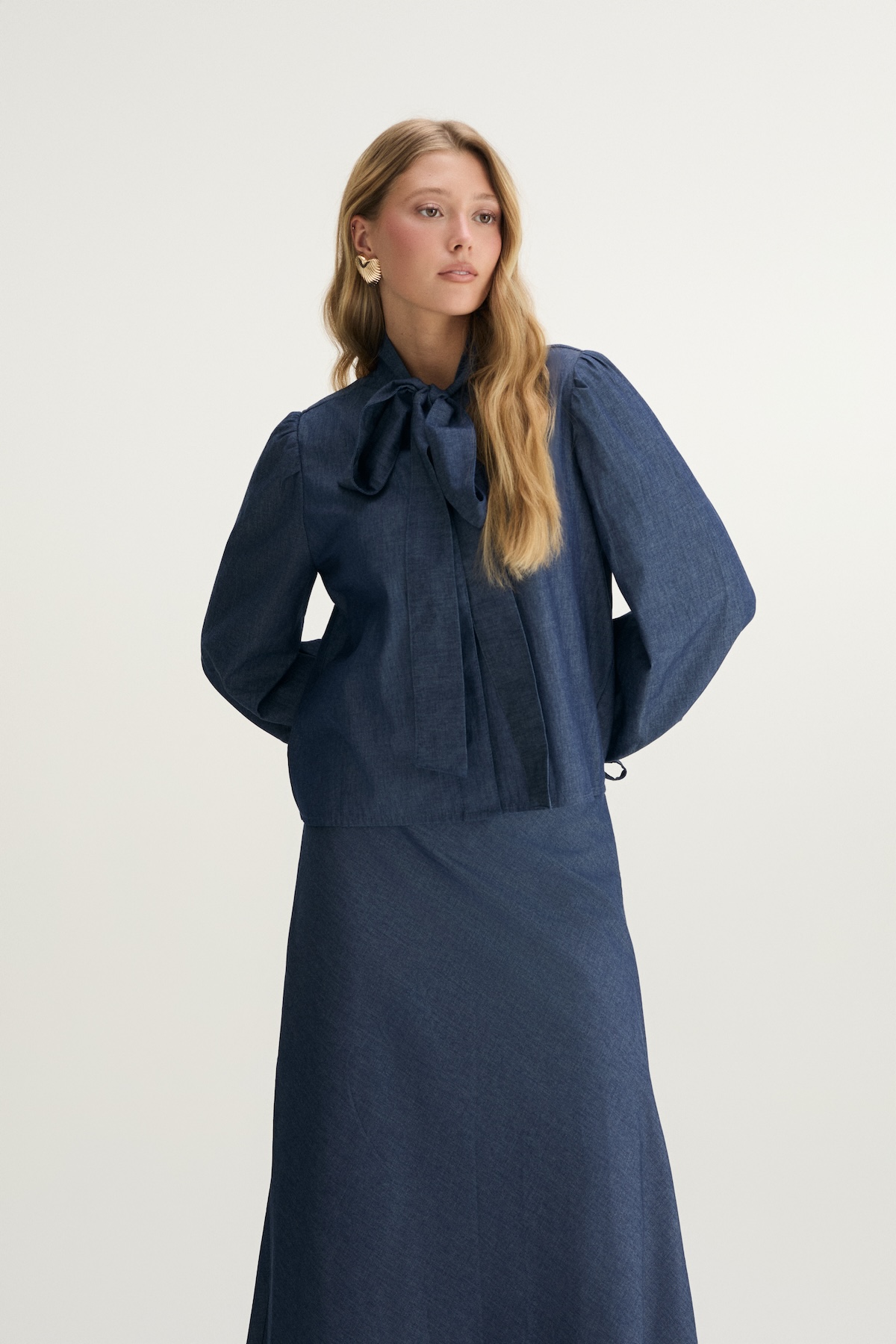 The SOFI Denim Blouse is denim with a romantic twist. With its relaxed cut, puffed sleeves, and a statement bow at the neckline, it brings a unique character to your wardrobe. Perfect with the matching skirt, but just as chic styled with jeans or tailored trousers.