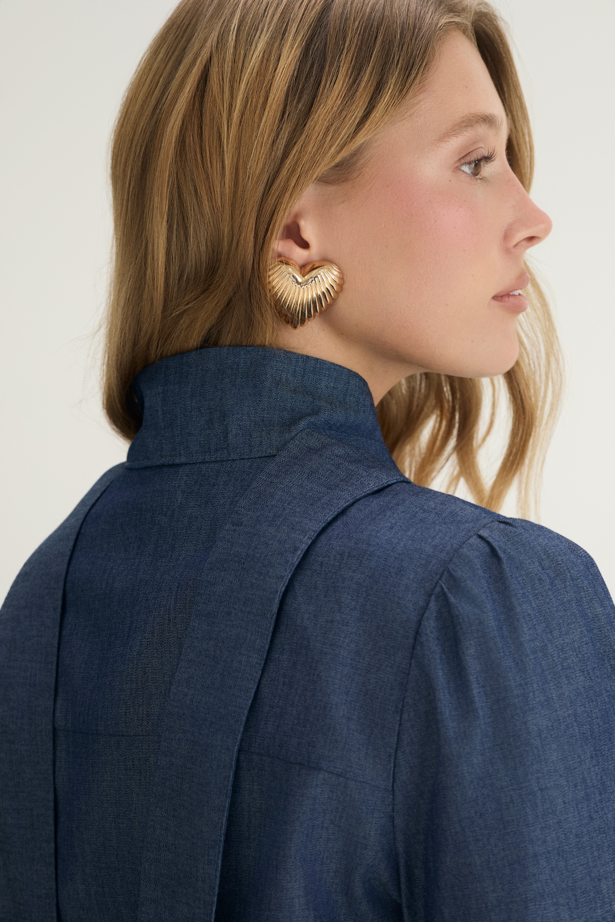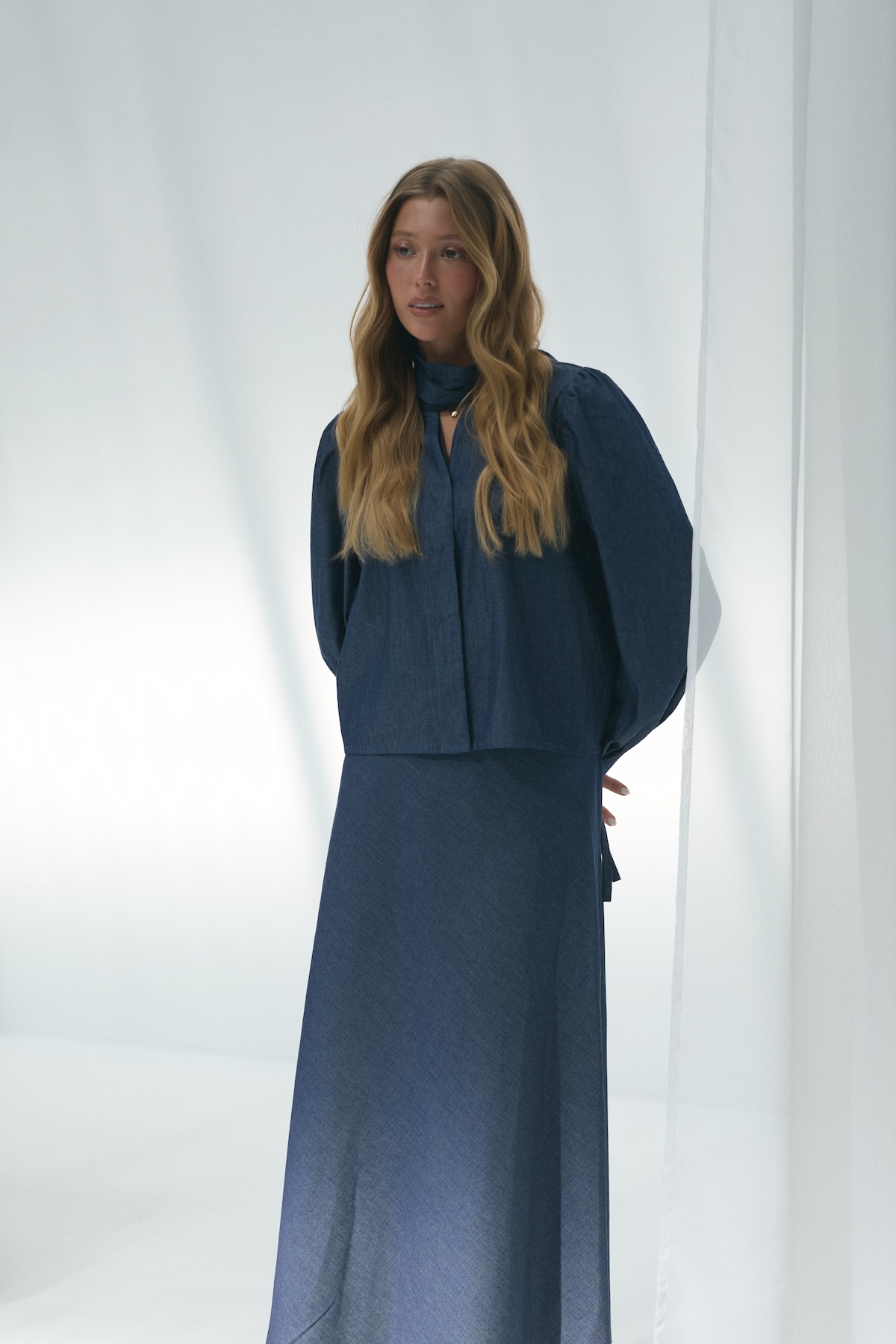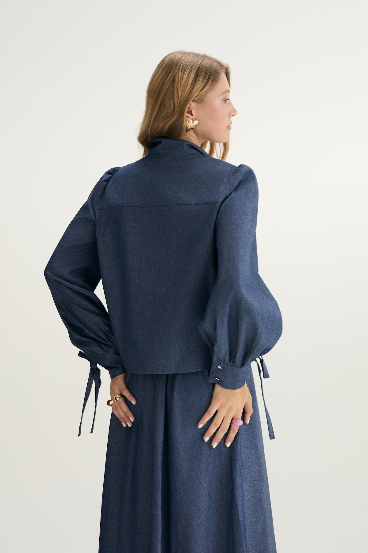 The SOFI Denim Blouse is denim with a romantic twist. With its relaxed cut, puffed sleeves, and a statement bow at the neckline, it brings a unique character to your wardrobe. Perfect with the matching skirt, but just as chic styled with jeans or tailored trousers.